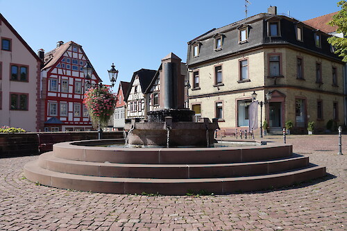 The fountain on Obermarkt, the Upper Market Place, was not part of the medieval water supply. It is a modern architectural decoration from 2002 designed by the Gelnhausen artist Achim Gogler. Stylised towers on the fountain symbolise the six parts of Gelnhausen and the relative sizes of the towers indicate sizes of the suburbs.