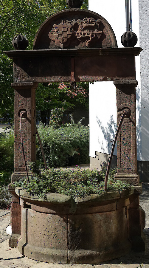 The well of the Teutonic Order. The draw well of the Teutonic Order still exists in their former trading post in Holzgasse. The Teutonic Order of Sachsenhausen had been represented in Gelnhausen since 1303. The site now belongs to the Catholic community and the draw well is located in the garden behind the parish offices. It is 1.55 metres in diameter and has two square sectioned pillars with capitals bearing the cross-beam dated 1587. Above the cornice there is a semi-circular stone with two coats of arms. This stone and the pillars are crowned with stone spheres.