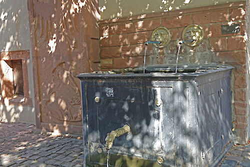 The Overflow from the Steinbrunnen is conducted by underground pipes. Opposite St Mary’s church at the junction of Am Steinbrunnen and Obere Haitzer Gasse there is a cast iron trough. Here the water flows from two lions’ heads.
