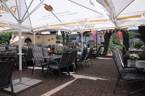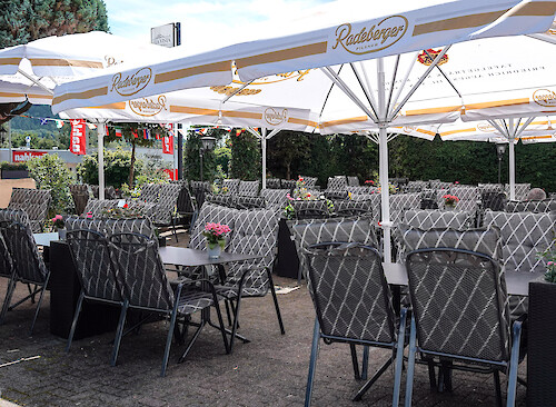 Die direkt angrenzende, von Grün umgebene gemütliche Biergarten-Terrasse lädt in der warmen Jahreszeit nicht nur zum Verweilen und Genießen ein; sie ist auch ein beliebter Ort zum Treffen mit Freunden, Familie und Bekannten. Bis zu 100 Gäste finden Platz - ganz nach Wunsch in der Sonne, unter Sonnenschirmen oder den großen schützenden Markisen.