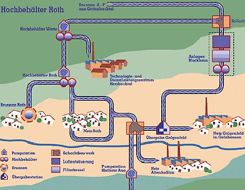 Der Hochbehälter Roth weist in seiner Versorgungsaufgabe eine Besonderheit auf. Seine beiden Rundkammern werden jeweils mit unterschiedlichen Wasserqualitäten gespeist.